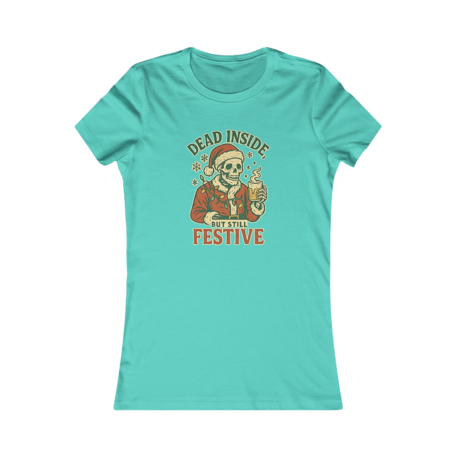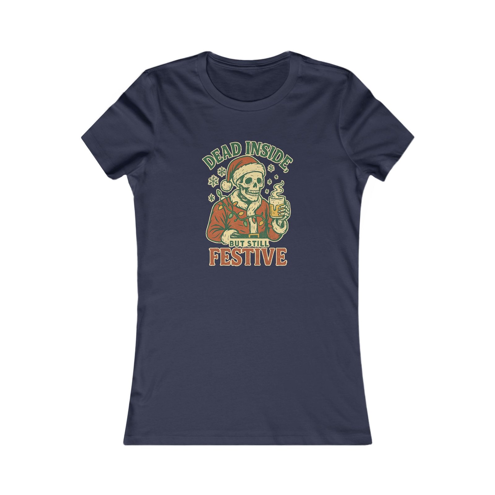 Cute, comfortable, and just the right amount of emotionally unwell—this fitted women’s tee features a vintage-style skeleton Santa tangled in Christmas lights and clutching a steaming holiday drink like he can barely cope. In other words: the most honest Christmas shirt you’ll ever wear.