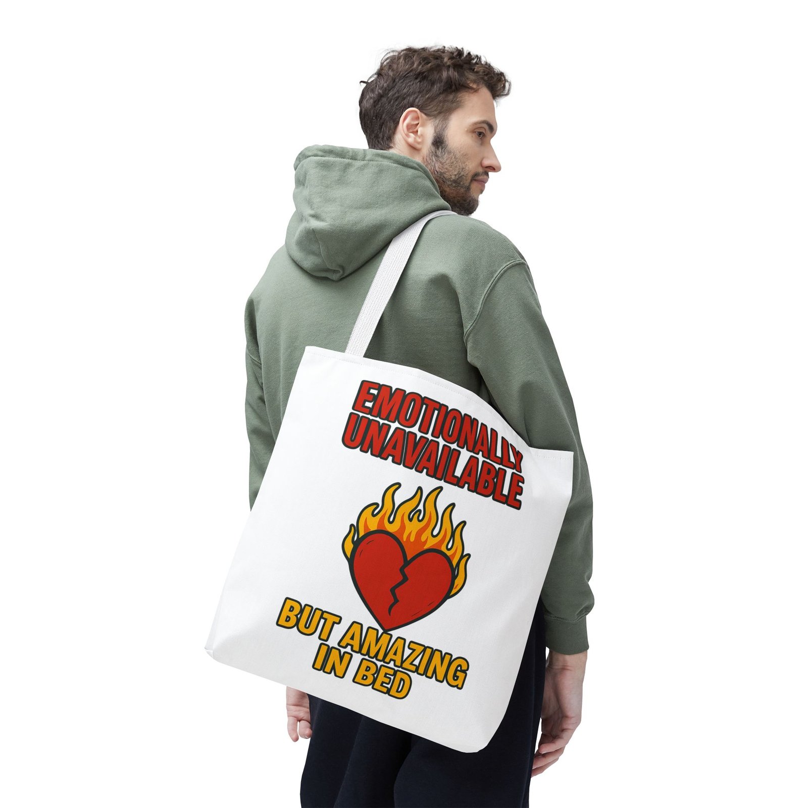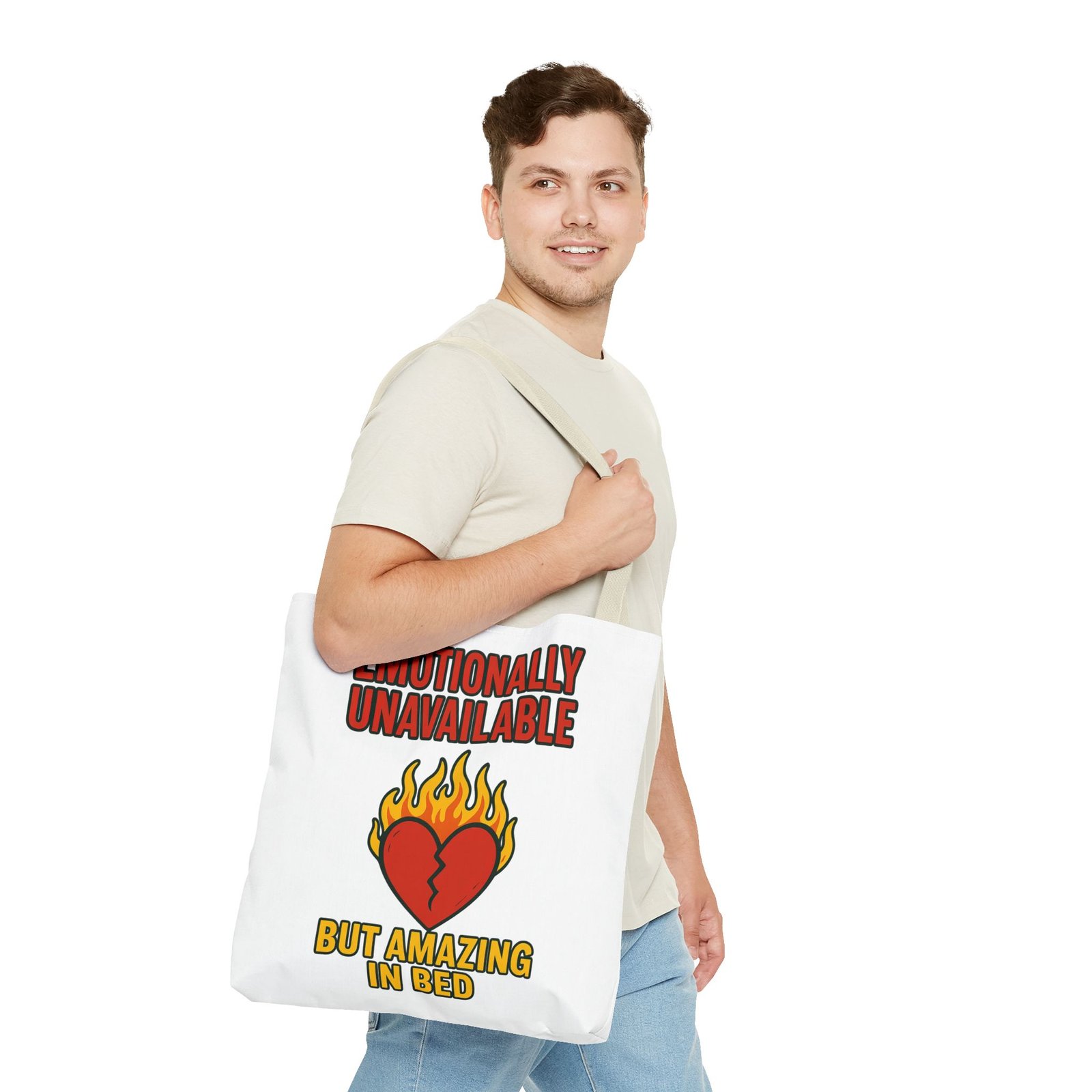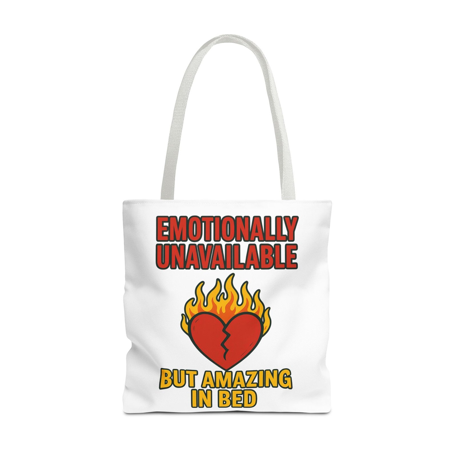 Bold, cheeky, and ready to wreak a little romantic havoc—this oversized 18″x18″ tote delivers fiery personality with its “Emotionally Unavailable But Amazing In Bed” design. Clean lines, a blazing broken heart, and unapologetic typography make this bag the perfect accessory for heartbreakers, beautiful disasters, and anyone who prefers their honesty loud, stylish, and extremely well-printed. The medium-weight polyester keeps its shape while resisting spills, scuffs, and emotionally questionable decisions. Boxed corners add depth for groceries, gym gear, books, laptops, or whatever chaotic life choices you need to haul around.