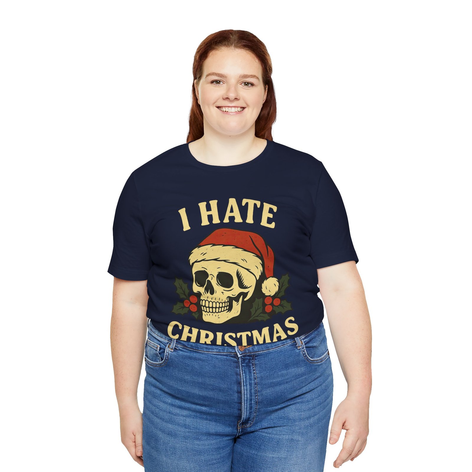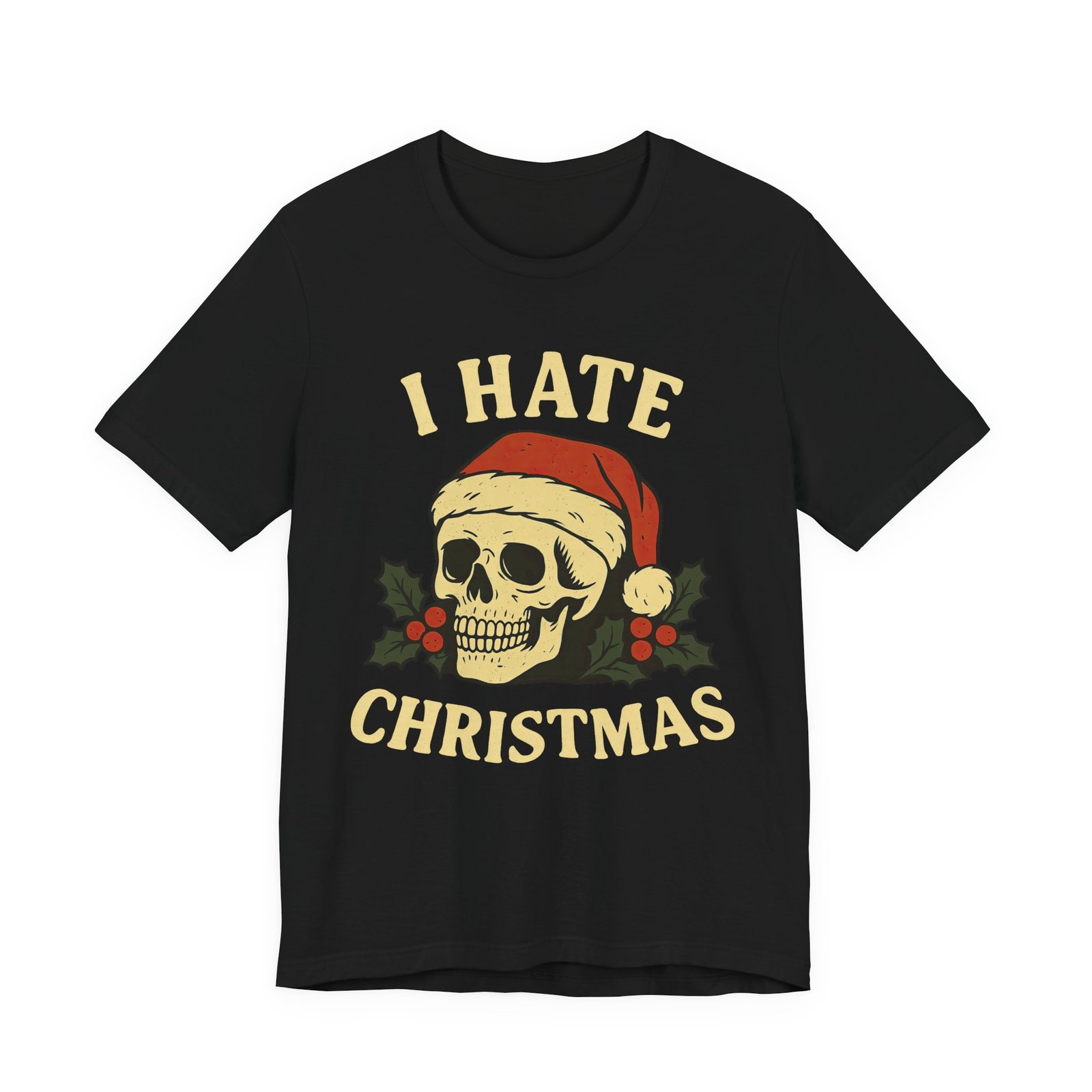 Soft, breathable, and fully done with the season—this unisex tee features a grinning skull in a Santa hat framed by holly, all under the glowing declaration I HATE CHRISTMAS. It’s direct, it’s hilarious, and it’s the perfect wearable mood for anyone who approaches the holidays with caffeine in hand and patience rapidly dwindling.