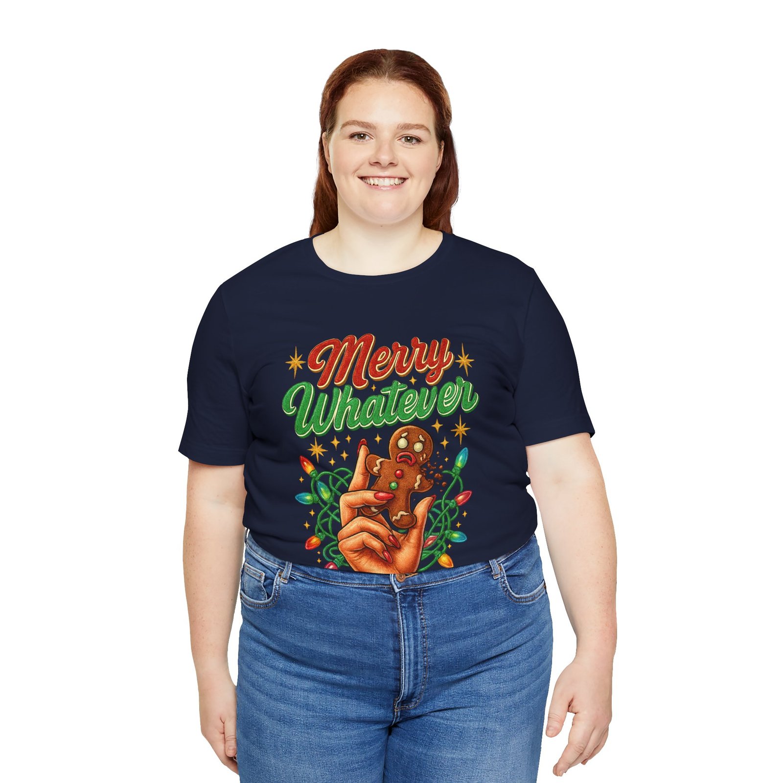 Featuring a fabulously manicured hand snapping a panicked gingerbread man beneath glowing Christmas lights, this unisex tee blends retro holiday style with deliciously chaotic energy. Soft, breathable cotton keeps it comfy all season long, while the bold artwork makes your “Merry… Whatever” attitude unmistakable from across the room.