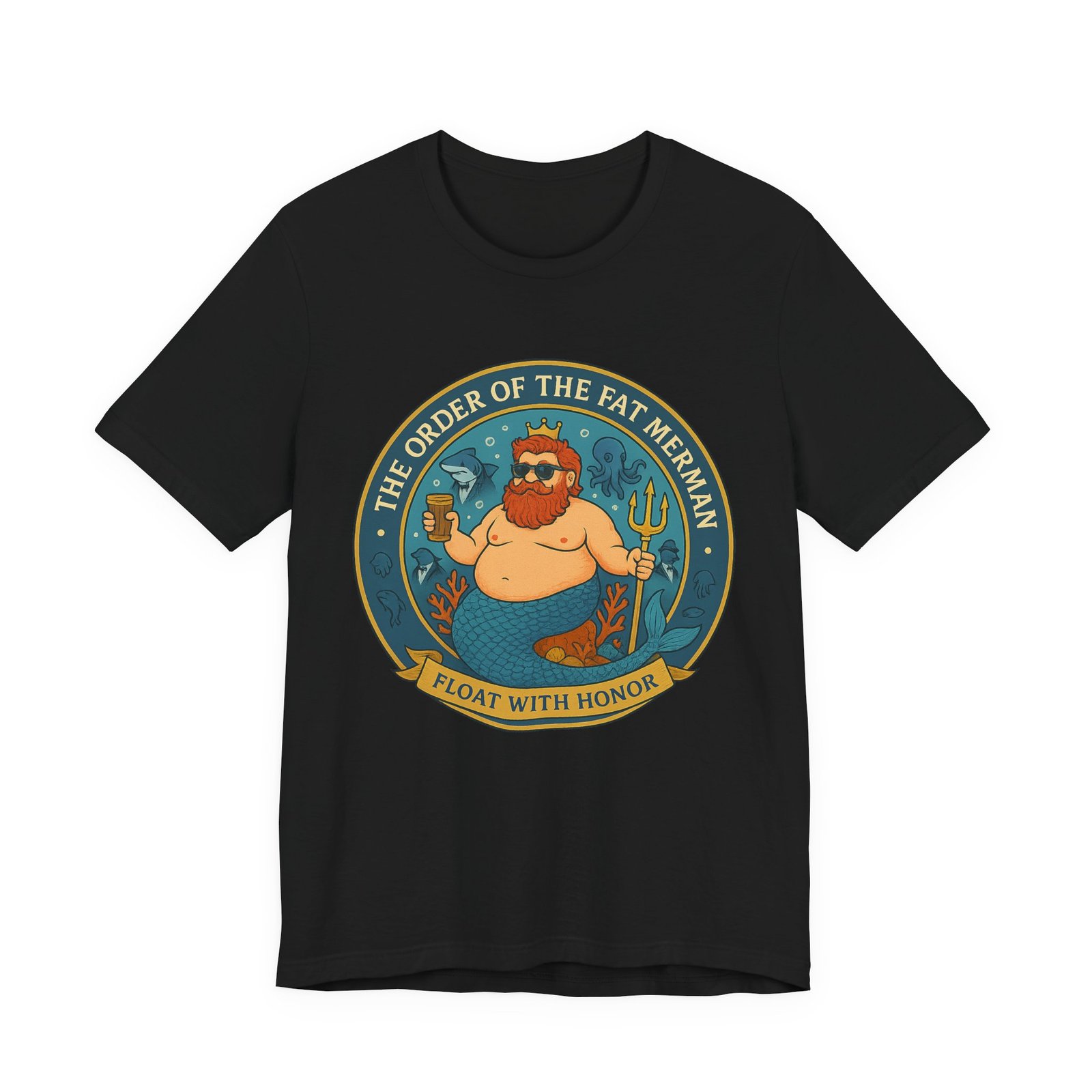 This lightweight jersey tee delivers soft, easy comfort with a splash of aquatic nobility and unapologetic charm. Smooth, breathable Airlume cotton keeps things effortless while the graphic dives full retro: the Official Seal of the Fat Merman Order, featuring the crowned, red-bearded legend himself—beer in one hand, golden trident in the other—surrounded by sea creatures, coral, bubbles, and the deep blue of his underwater kingdom.