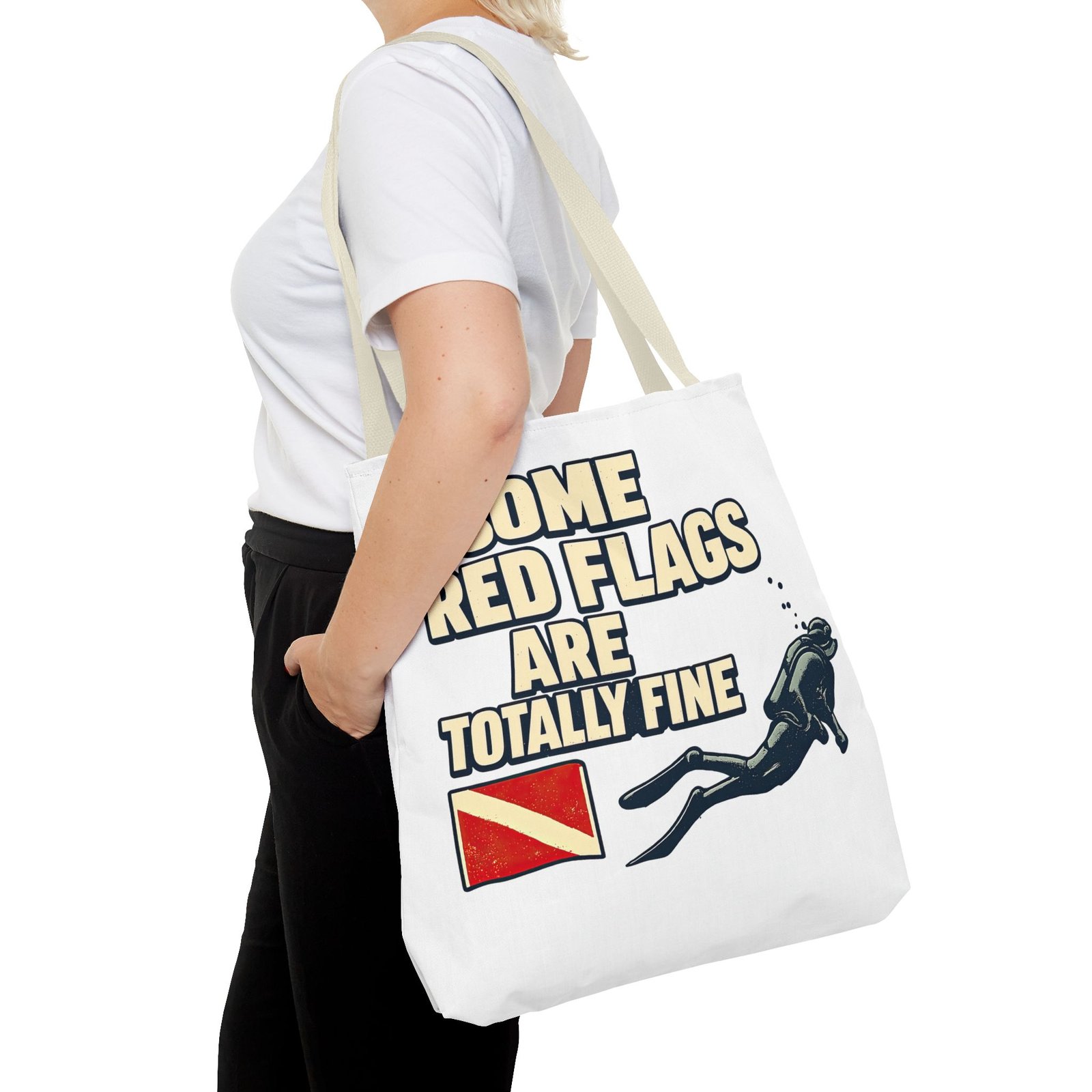 This tote is for people who understand that context matters. On land, red flags are warnings. Underwater, some of them are just information. Signals. Boundaries. A reminder to slow down, look around, and do the dive right.